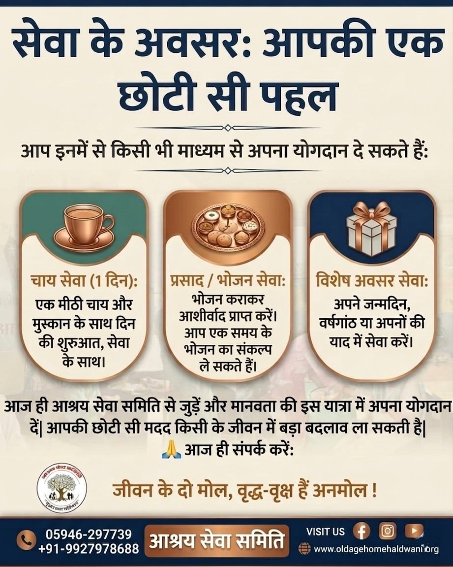 ​आश्रय सेवा समिति वृद्धाश्रम परिवार, हल्द्वानी की इस पावन यात्रा में आप भी अपना योगदान दे सकते हैं। आपकी एक छोटी सी पहल किसी के जीवन में बड़ा बदलाव ला सकती है।
